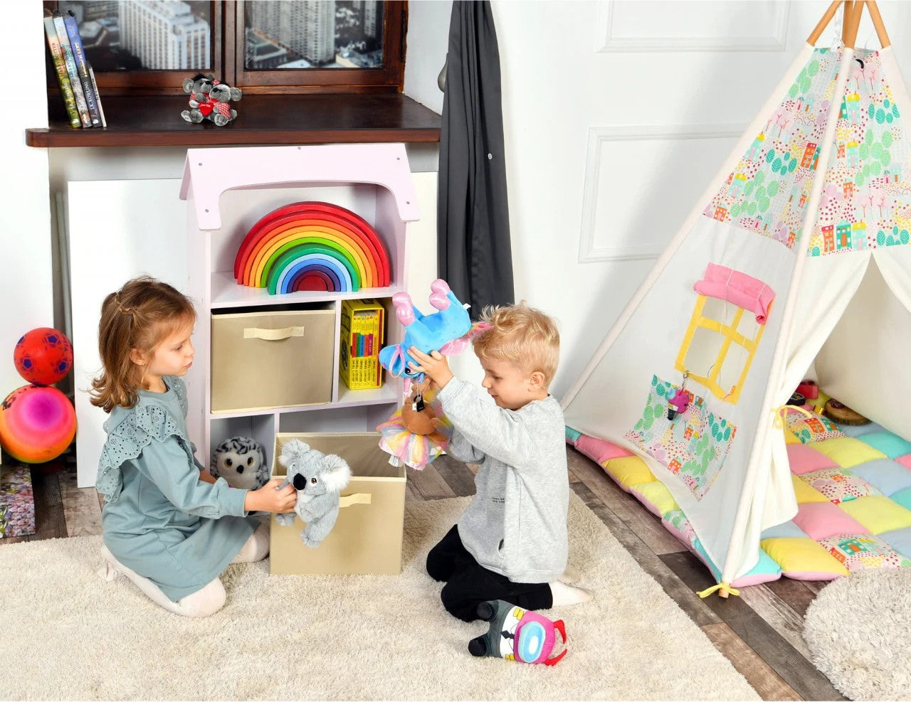 - Depozitare inteligentă pentru jucării: Cutiile de depozitare integrate sunt perfecte pentru a păstra ordine în cameră. Copiii vor învăța responsabilitatea și organizarea, în timp ce își păstrează jucăriile preferate la îndemână. Funcționează perfect ca un organizator pentru jucarii, însă dacă este nevoie de mai mult spatiu pentru carti, cutiile pentru jucarii se pot scoate pentru a elibera rafturile.