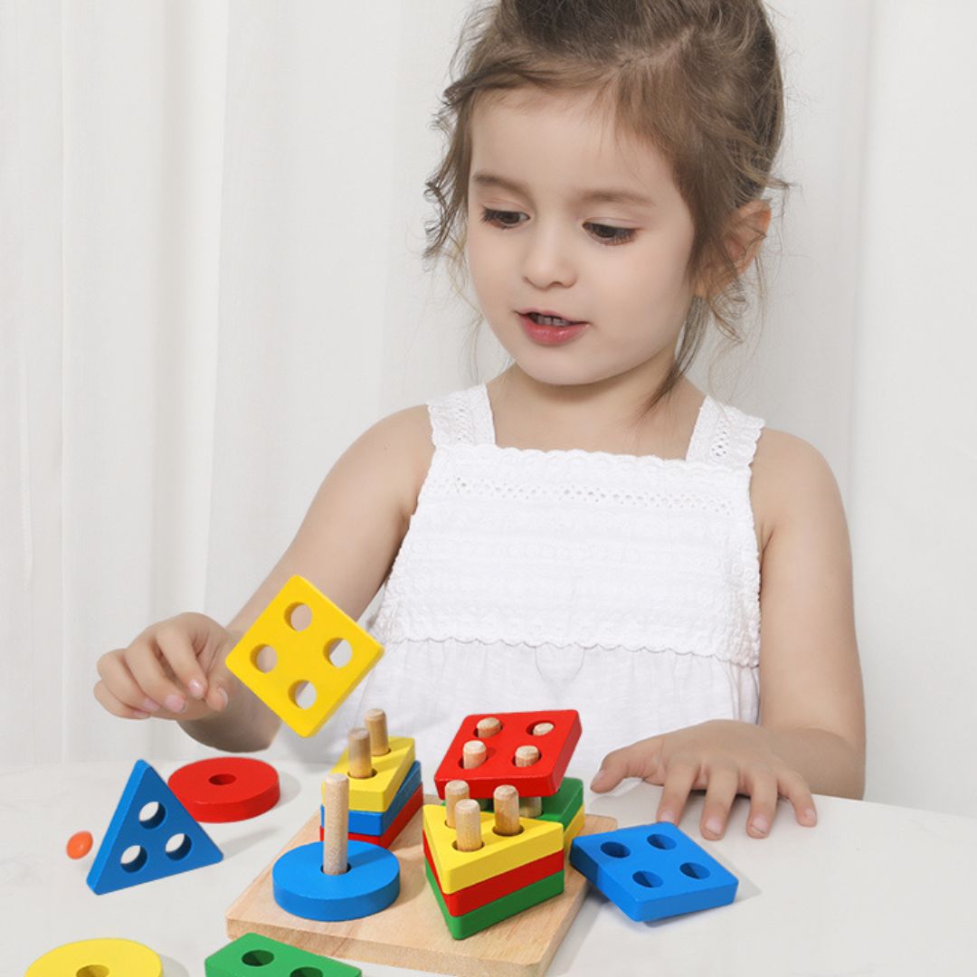 Dezvoltarea coordonării mână-ochi: Stivuirea pieselor pe tije încurajează precizia.