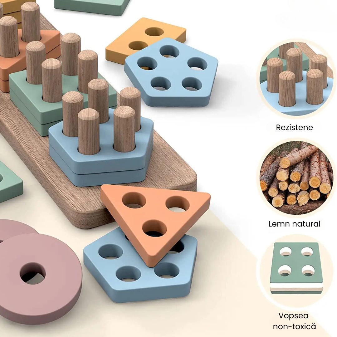 Joc de sortare a formelor din lemn, 5 culori pastelate, 1 an+