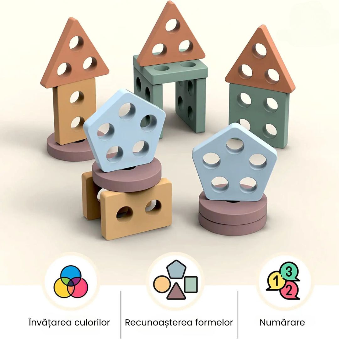 - Recunoașterea formelor și culorilor: Ajută copilul să identifice și să diferențieze diverse forme geometrice.