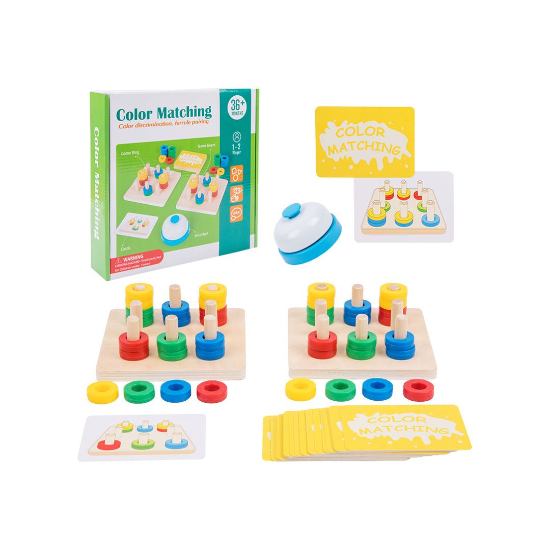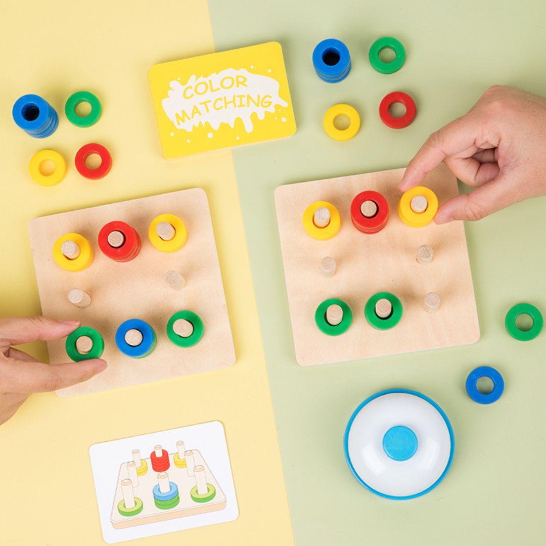 Acest joc din lemn este perfect pentru a-i ajuta pe cei mici să-și dezvolte abilități esențiale, într-un mod distractiv și captivant. Copiii vor învăța să recunoască culorile, să sorteze și să clasifice inelele colorate, în timp ce își îmbunătățesc coordonarea ochi-mână.