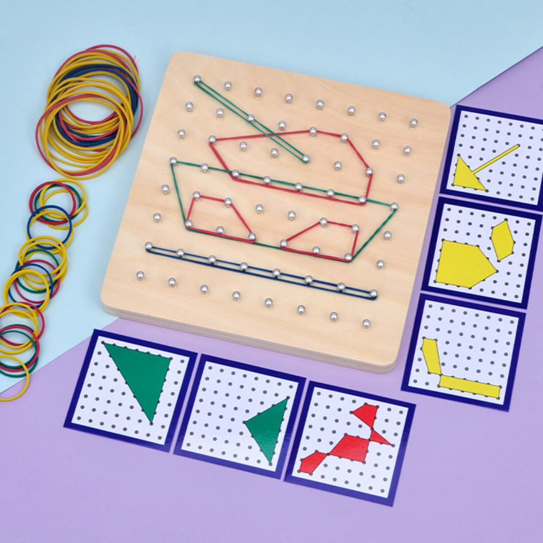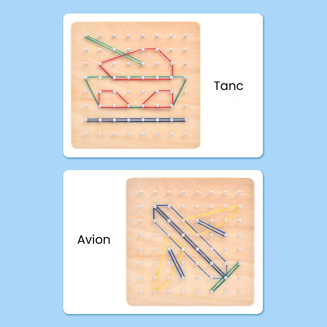 Un joc Montessori creativ și interactiv care îi ajută pe cei mici să învețe formele geometrice într-un mod simplu și distractiv! Copilul folosește benzile elastice pentru a reproduce modelele de pe carduri, dezvoltând astfel abilități importante prin joacă.