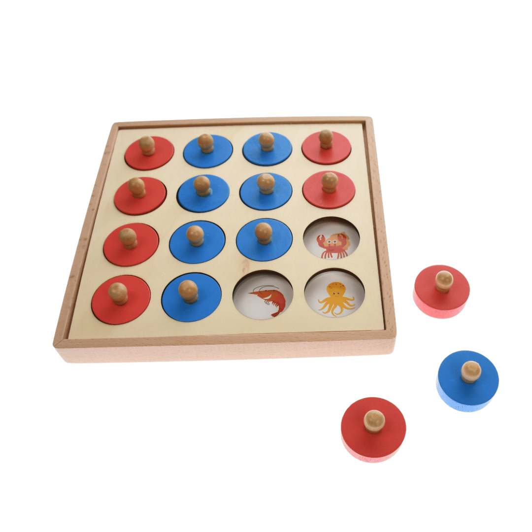 16 piese din lemn colorate în roșu și albastru, cu butoane din lemn pentru acoperirea imaginilor. -