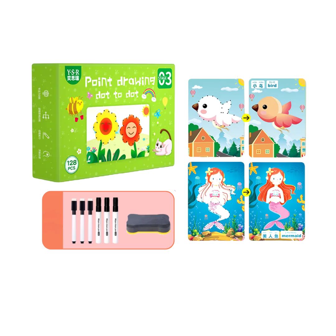 Acest set educativ este ideal pentru copiii de peste 4 ani, ajutându-i să-și dezvolte atenția, concentrarea, motricitatea fină și creativitatea. Cu 128 de planșe ilustrate și reutilizabile, cei mici pot desena animale, sirene, flori, păsări și alte forme simpatice prin unirea punctelor, învățând prin joacă și descoperire vizuală.