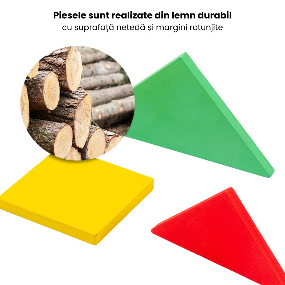 Setul educațional „Egg Puzzle” din lemn este un joc tip Tangram, special creat pentru a dezvolta creativitatea și gândirea logică a copiilor. Folosind piesele din lemn, cei mici pot reproduce modele ilustrate pe cutie sau pot da frâu liber imaginației, construind propriile creații.