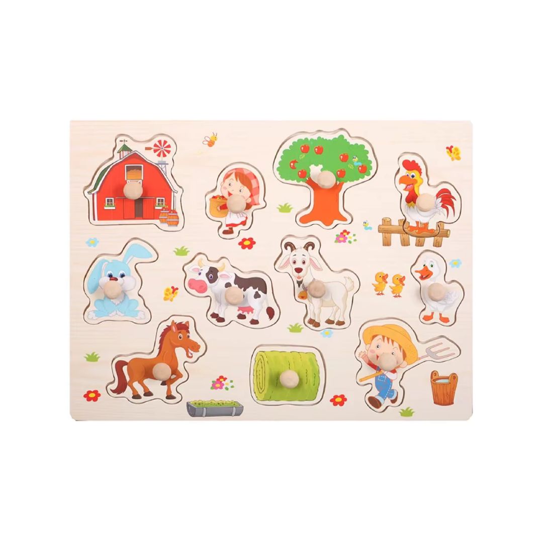 - Puzzle-ul include 12 piese incastru, cu butoni mari din lemn, ușor de apucat de mâinile copilașilor.