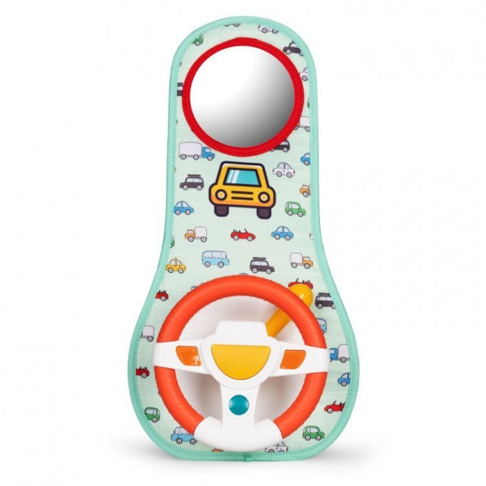 Salteluta interactiva de agatat pe tetiera din masina pentru copii de la 18 luni. Jucaria este perfecta pentru calatoria copilului si asigura o plimbare linistita cu masina. Avantajul saltelutei este volanul rotativ si butoanele care emit sunetele claxonului si ale indicatoarelor de directie. In plus, jucaria are 10 melodii vesele, o oglinda rotunda si un buton pentru a porni si a inchide masina.