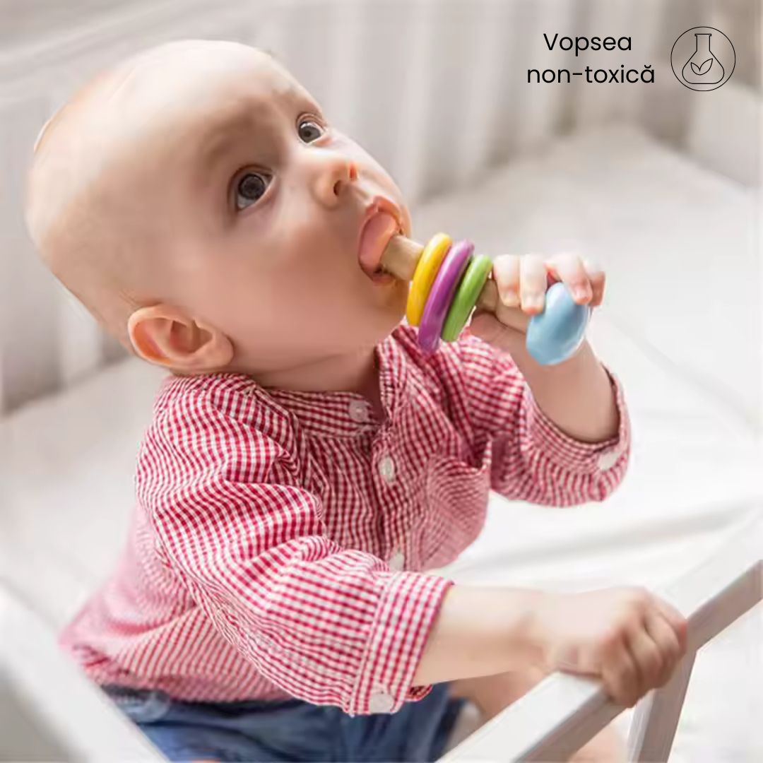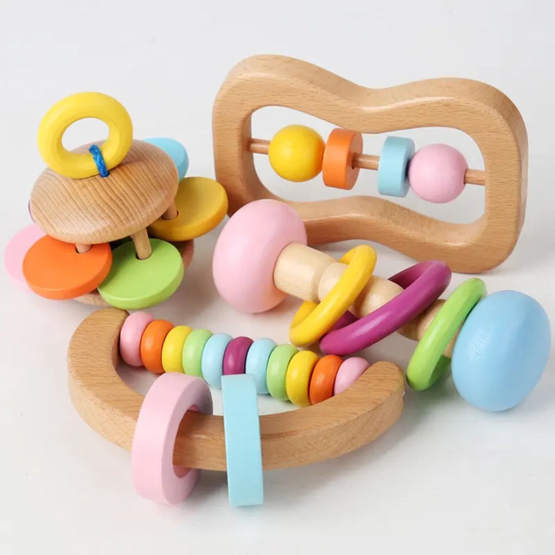 Acest set de jucării senzoriale din lemn oferă o combinație ideală de distracție și dezvoltare timpurie pentru bebeluși. Realizate din materiale naturale și sigure, piesele sunt proiectate pentru a stimula simțurile și abilitățile motorii.
